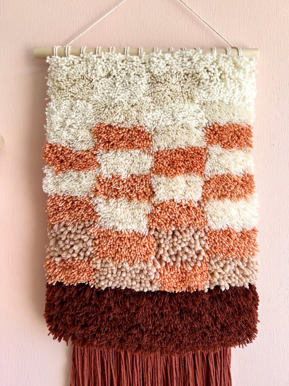 This lovely piece was hand knotted and woven in some of my favorite colors and fibers from my personal stash. The checkerboard pattern and warm tones would work equally well on a white or painted wall.